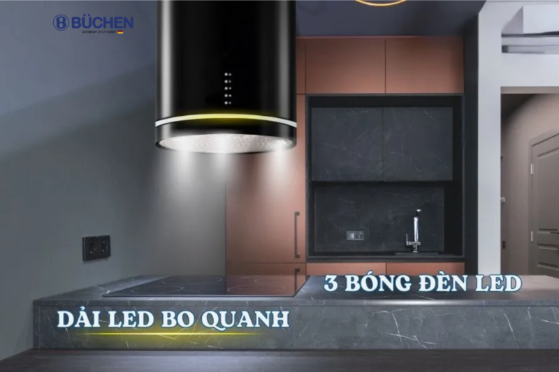 Đèn LED 3 bóng siêu sáng kết hợp với dải LED tròn bo thân máy giúp tạo nên không gian bếp sáng tạo và ấn tượng. Với ánh sáng mạnh mẽ từ 3 bóng LED, máy hút mùi Buchen Smart 885ISB không chỉ chiếu sáng đủ mạnh mà còn giúp tăng cường khả năng quan sát khi nấu ăn. Dải đèn led bo tròn thân máy với đa dạng màu sắc bắt mắt cho căn bếp luôn hiện đại và thu hút.